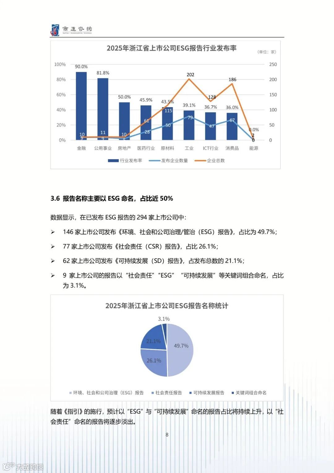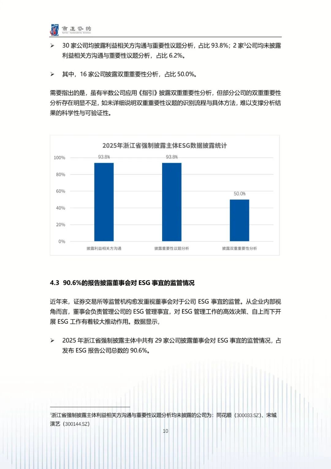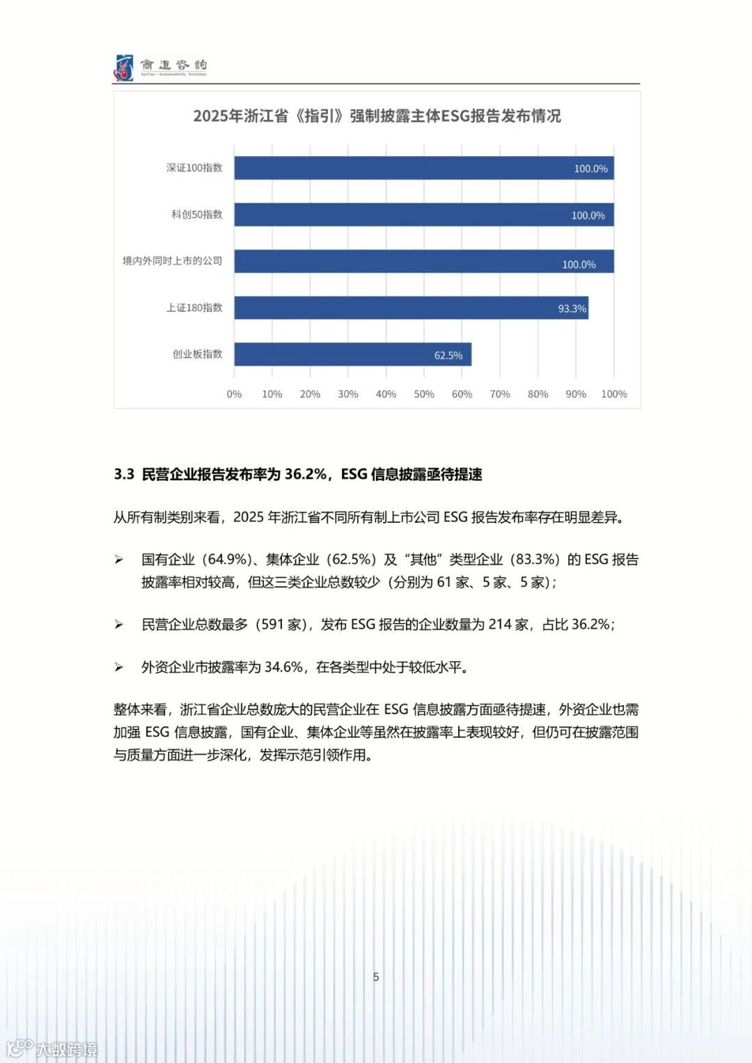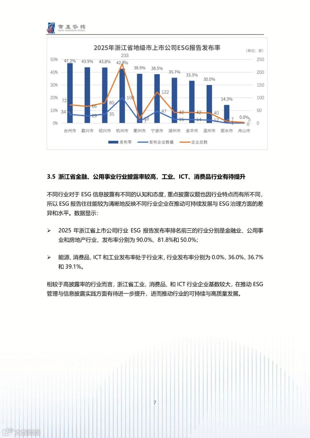 报告呈现了全省披露概况:2025年ESG报告发布率40.6%,强制披露主体发布率88.9%;民营企业披露率36.2%待提升,杭州披露规模居首,台州、嘉兴等市披露率领先,金融、公用事业行业披露率较高,工业、ICT等行业需加强。