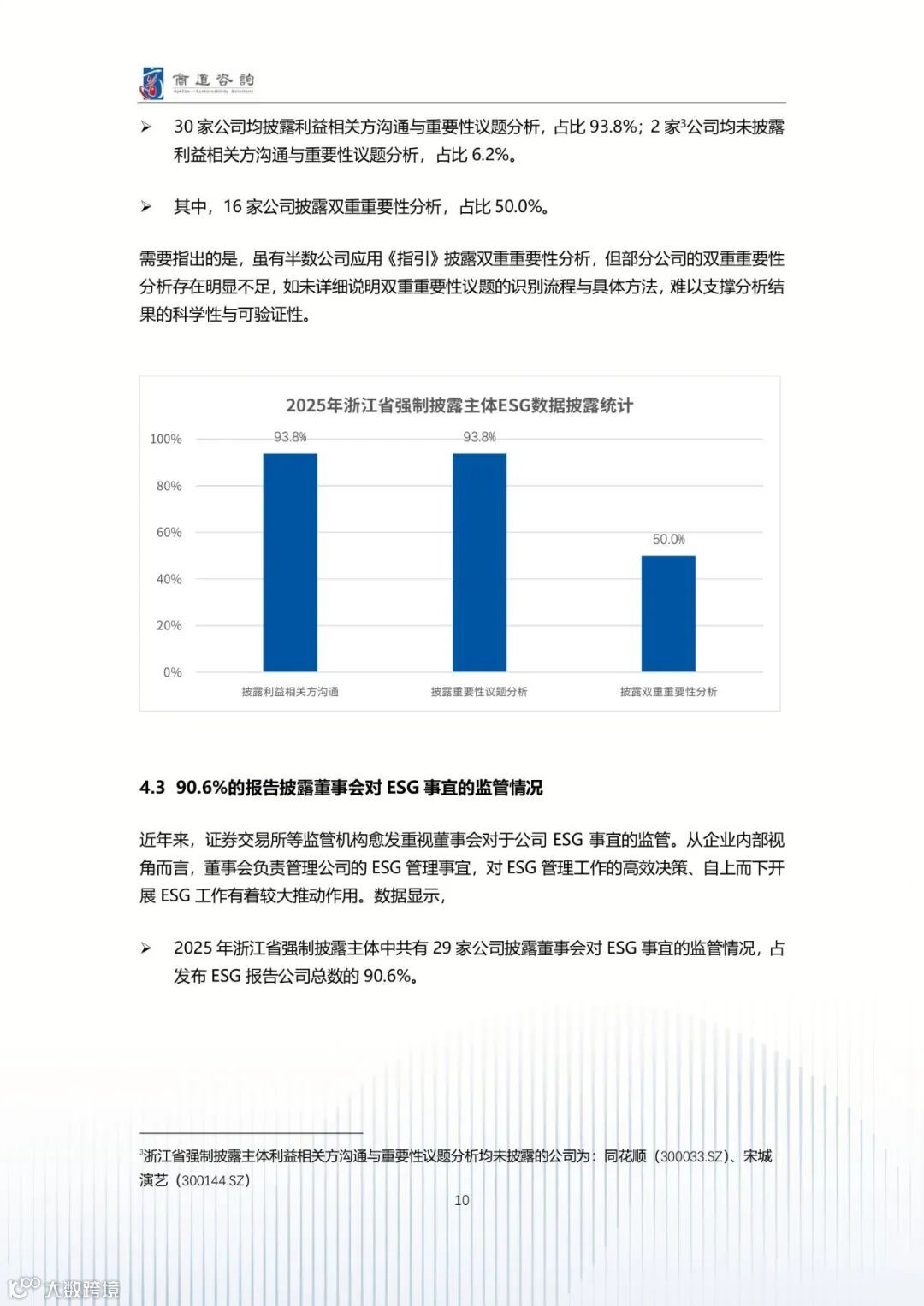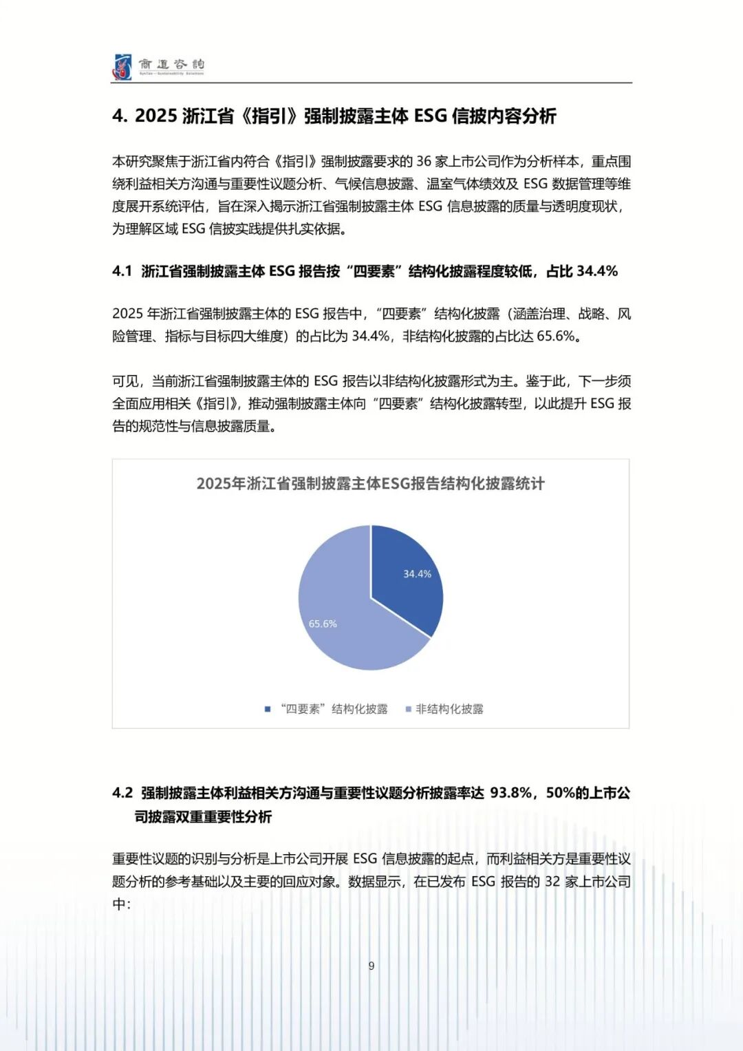 强制披露主体在利益相关方沟通、气候变化议题披露上表现较好,却面临 “四要素” 结构化披露不足、尽职调查披露短板等问题。最后,报告提出强化双重重要性分析、完善结构化披露等建议,为浙江省上市公司提升ESG信披质量、推动可持续发展提供参考。