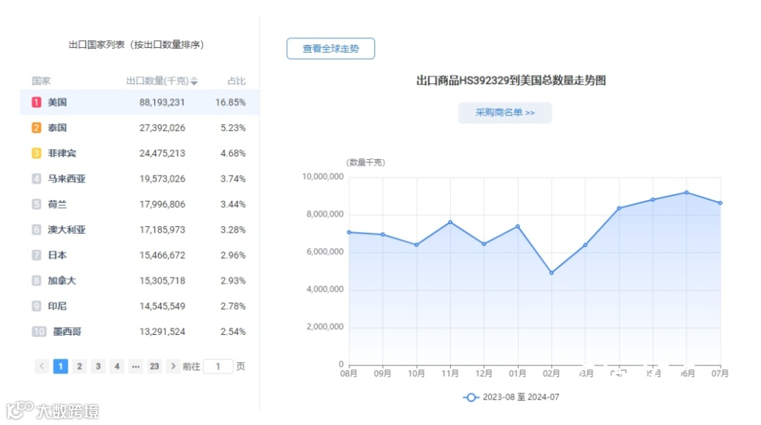 根据市场公布的数据,HS编码为392329的塑料袋和包装袋产品已销往全球221个国家和地区。其中,美国是该类产品最大的进口国,年进口总量达88,193,231千克,进口金额高达48,364万美元。