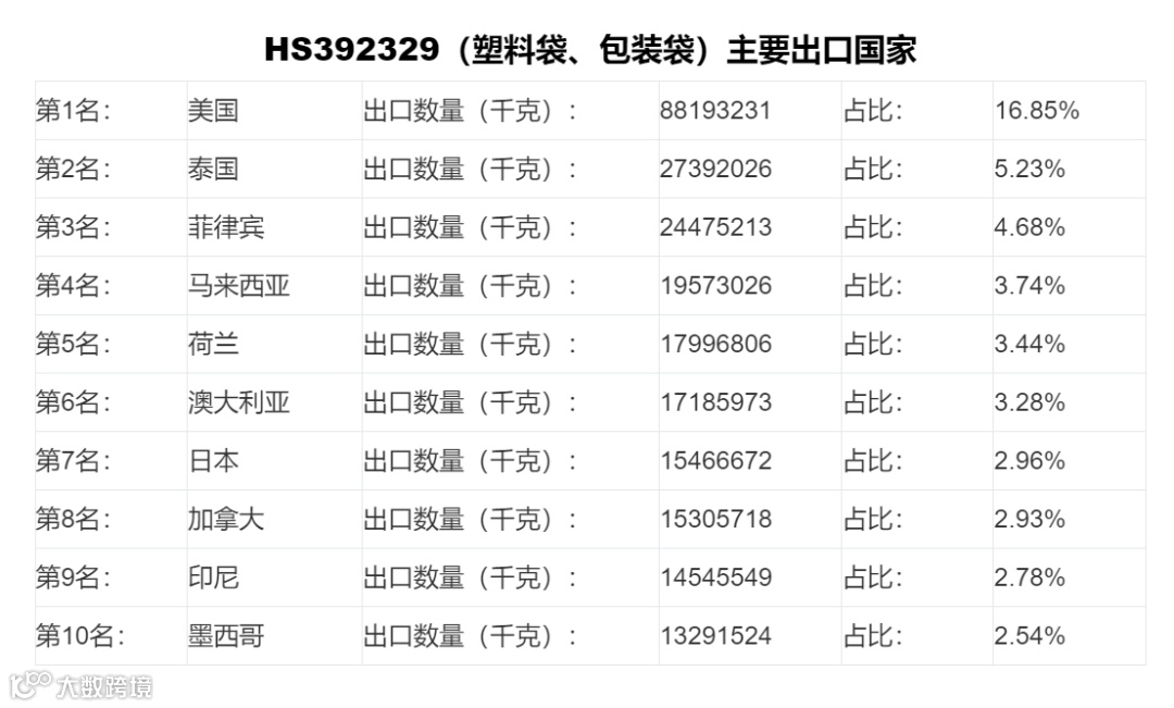 口岸清关行根据市场公布的数据,HS编码为392329的塑料袋和包装袋产品已销往全球221个国家和地区。其中,美国是该类产品最大的进口国,年进口总量达88,193,231千克,进口金额高达48,364万美元。