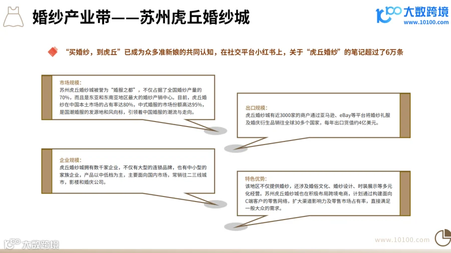 苏州虎丘婚纱城被誉为“婚服之都”,不仅占据了全国婚纱产量的70%,而且是东亚和东南亚地区最大的婚纱产销中心。虎丘婚纱城有近3000家的商户通过亚马逊、eBay等平台将婚纱礼服及婚庆衍生品销往全球30多个国家,每年出口货值约4亿美元。该地区不仅提供婚纱,还涉及婚俗文化、婚纱设计、时装展示等多元化经营