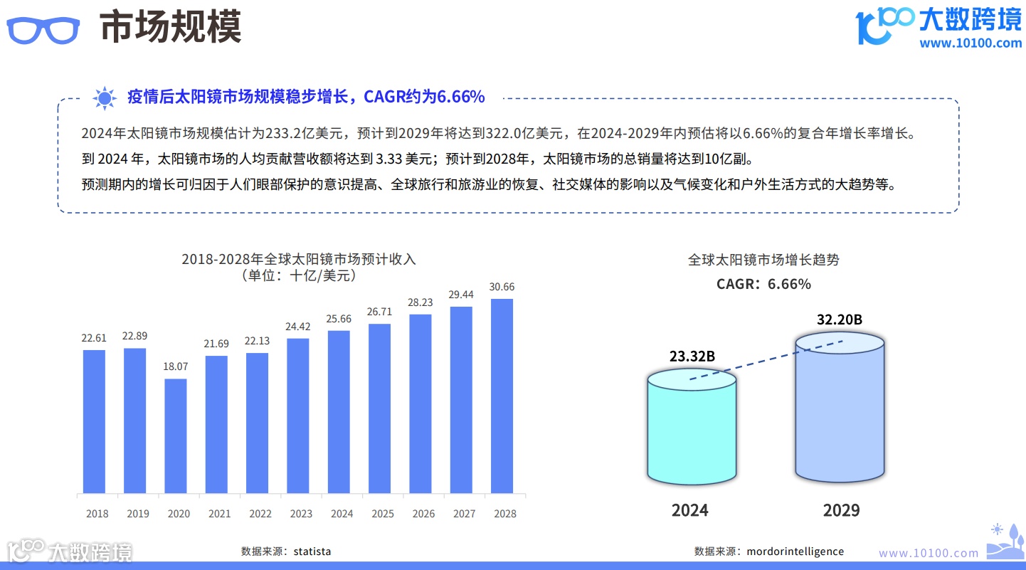 疫情后全球太阳镜市场规模呈稳步增长态势,2024 - 2029 年预估复合年增长率(CAGR)约为 6.66%,2024 年市场规模估计达 233.2 亿美元,预计 2029 年将升至 322.0 亿美元。同时,人均贡献营收额也在逐步提升,到 2024 年人均达 3.33 美元。在销售渠道方面,传统线下零售虽仍占主导,但线上零售占比逐年递增,2024 - 2030 年电商规模 CAGR 预计为 6.8%,且移动端收入占比自 2023 年起超桌面端并持续增长。消费者热衷在线购物的原因包括节省时间、免费送货、社交媒体营销及可依据在线评论等做出购买决策。
