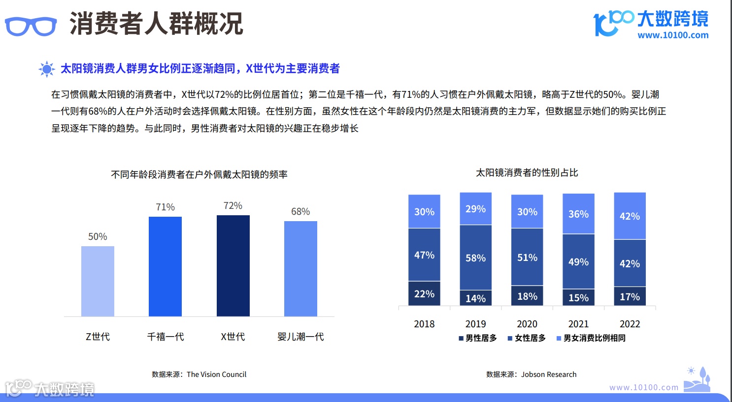 太阳镜消费人群男女比例渐趋平衡,X 世代是主要消费者,占比 72%,千禧一代占 71%,Z 世代占 50%,婴儿潮一代占 68%。性别上,女性购买比例逐年下降,男性兴趣稳步上升。在佩戴习惯上,北美中西部人群更常佩戴,超 67% 受访者户外活动时部分或大部分时间会佩戴,约 70% 父母会让孩子户外时佩戴,且夏季佩戴比例更高。 -