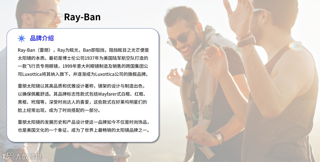 Ray-Ban是由博士伦公司于1937年为美国陆军航空队打造的一款飞行员专用眼镜,后被意大利跨国集团公司Luxottica收购成为旗下品牌。Ray-Ban以其高品质和优雅设计著称,成为时尚饰品的一部分。其标志性款式如Wayfarer式白框、红框、黑框等深受好莱坞明星喜爱,成为了时尚搭配的一部分。