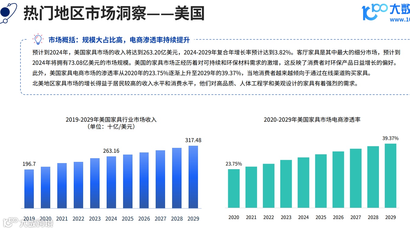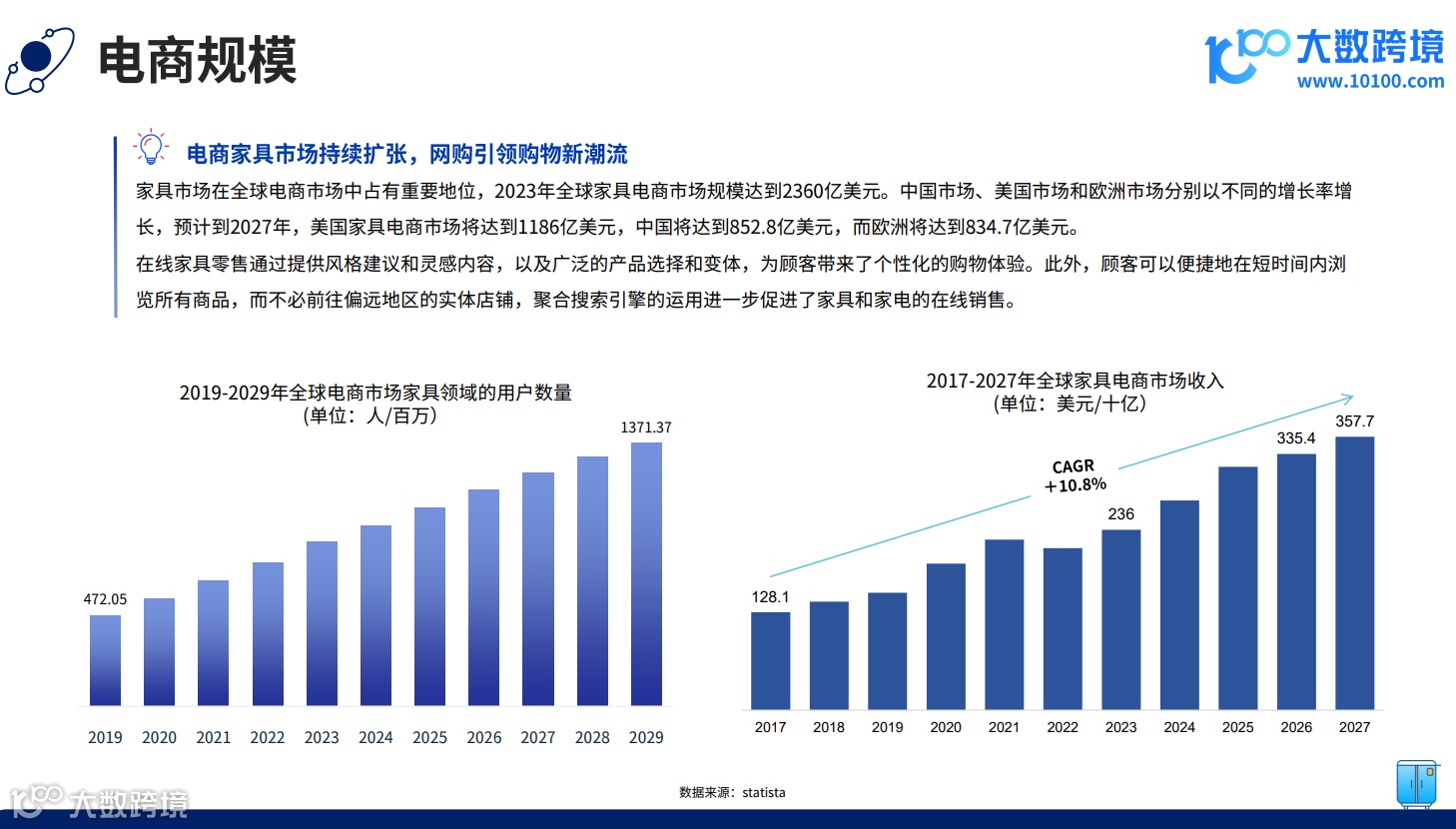 - 根据报告,2023年全球家具电商市场规模达到2360亿美元,预计到2027年,美国家具电商市场将达到1186亿美元,中国将达到852.8亿美元,而欧洲将达到834.7亿美元。这些数据表明全球家具市场正在持续增长,并且各个地区的市场表现也有所不同。