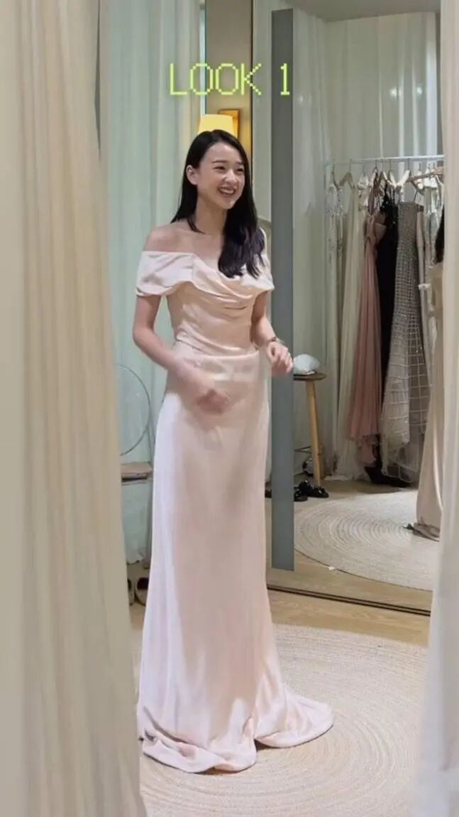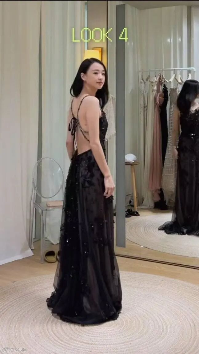 첫 번째 룩은 부드러운 파스텔톤 오프숄더 드레스였다. 드레이핑 디테일과 은은한 광택이 어우러져 사랑스럽고 청초한 매력을 극대화했다. 이어지는 룩에서는 화려한 실버 비즈 장식 드레스로 고급스러움을, 시스루 블랙 드레스에서는 백리스 디테일로 과감한 반전미를 선보였다.
