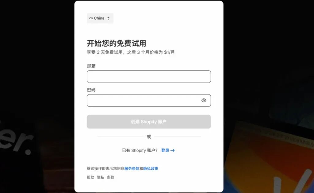 前文介绍了shopify定价,不管预算够不够,如果想体验一下shopify建站也是随时可以的,因为shopify提供3天免费试用,你只要有个邮箱就行,不过建议用outlook,hotmail,gmail邮箱。