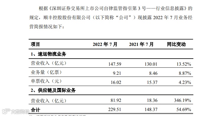 顺丰速运7月营业收入147.59亿元,同比增长13.52%;业务完成量9.21亿票,同比增长8.87%;单票收入16.02元,同比增长4.23%。