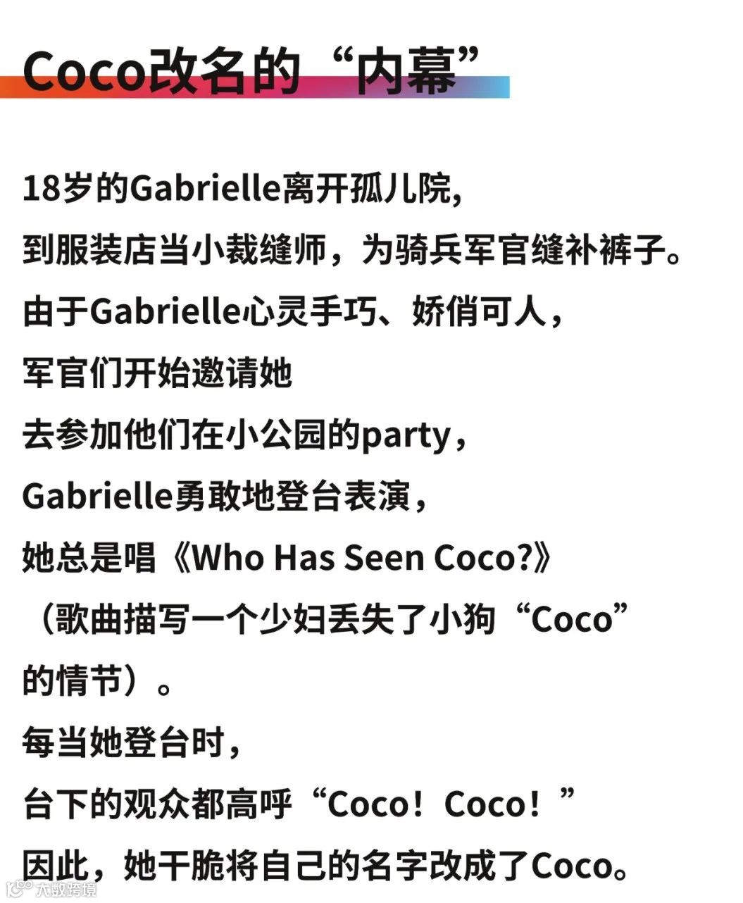 十二岁母亲离世,父亲离家,被安置在法国奥巴赞一家名为“圣心修女会”的孤儿院,由朴素的修女抚养长大,也学会了缝纫,在十八岁那一年也将自己的名字改为Coco。这些悲情元素构成了Chanel故事的开端,也成为后来她创立品牌的灵感来源之一。