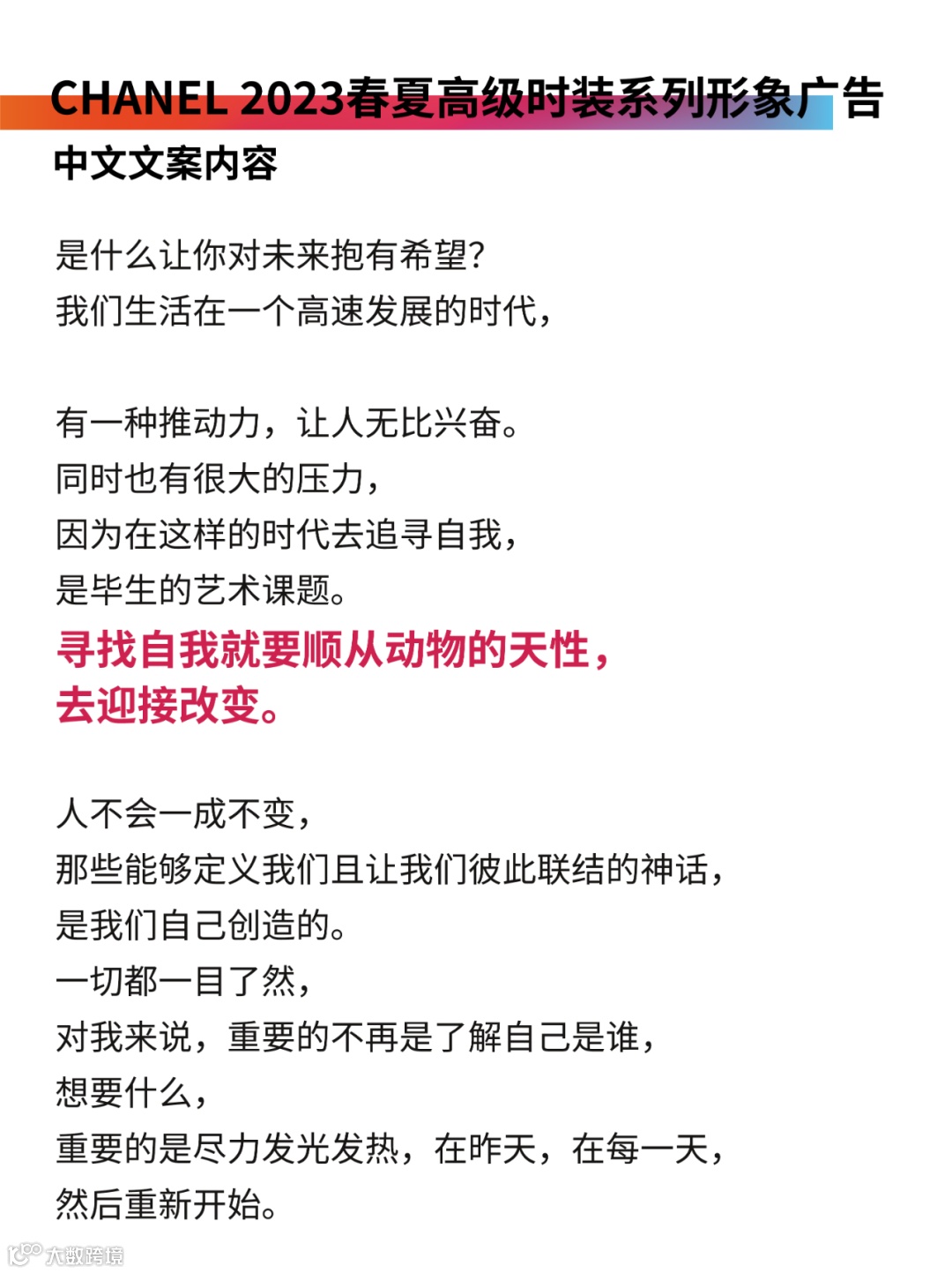 影片中提到,“寻找自我就要顺从动物的天性,去迎接改变”,这点亮了一直以来CHANEL想要展现的创造性和时尚革新的勇气。Chanel女士曾说:“My life didn't please me, so I created my life.(我的人生并不如我所愿,所以我自己创造人生。)”不管何时何地,CHANEL的广告语都始终保持着品牌的开拓性,没有抽离他们所展现的风格。