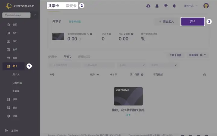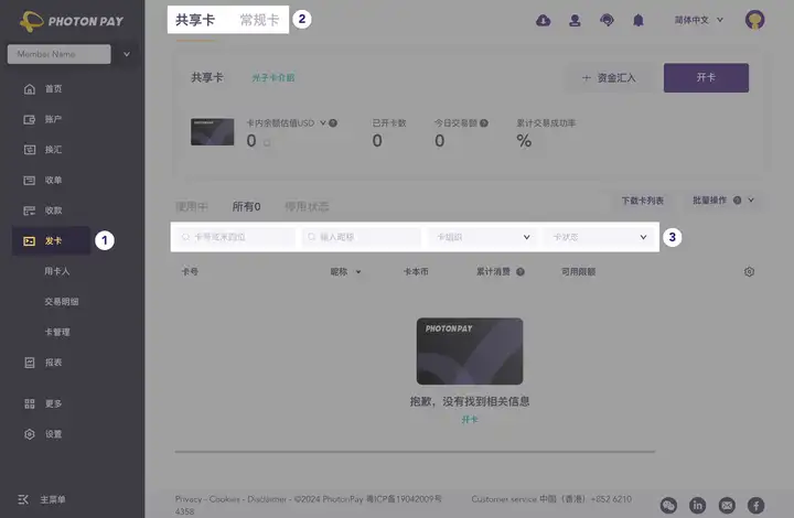 PhotonPay光子易用户登录商户后台,点击【发卡】—【共享卡/常规卡页面】—【开卡】