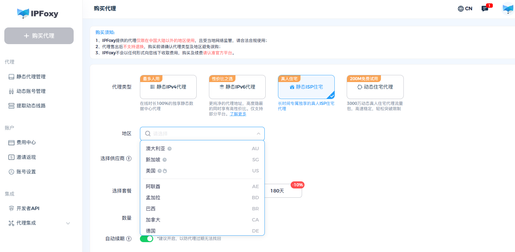 “独享”是关键: 确保你使用的IP是 完全独享 的,不被他人共享使用,避免因他人违规导致你的IP连带被封。IPFoxy 的静态住宅代理正是这种类型。