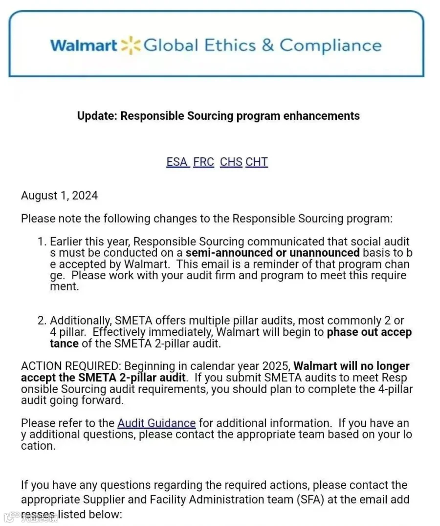 自2025年起,沃尔玛不再接受SMETA 2 Pillar审核报告,若选择SMETA审核,则必须使用SMETA 4 Pillar标准。