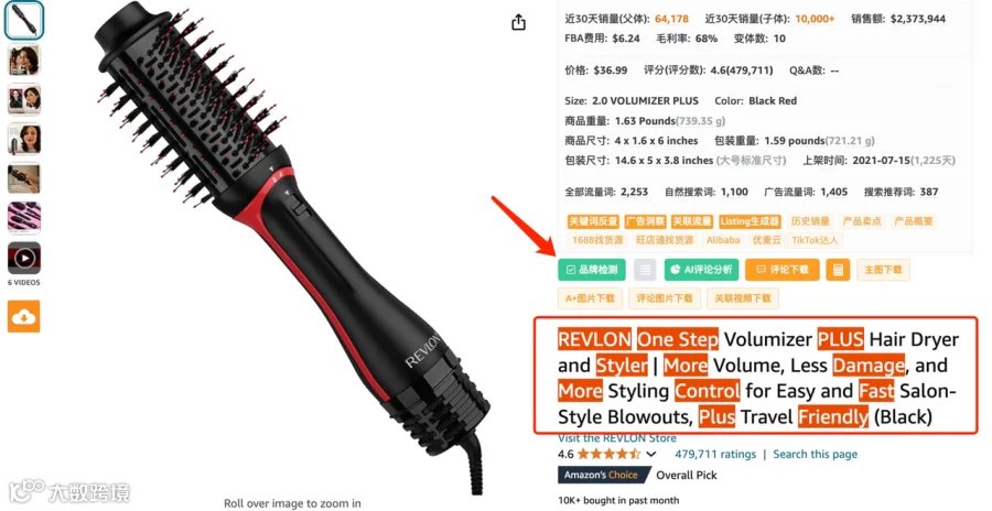 【拓展小知识:检查Listing标题和五点描述中是否存在亚马逊品牌词,卖家精灵“品牌检测”可以一键帮你搞定。】