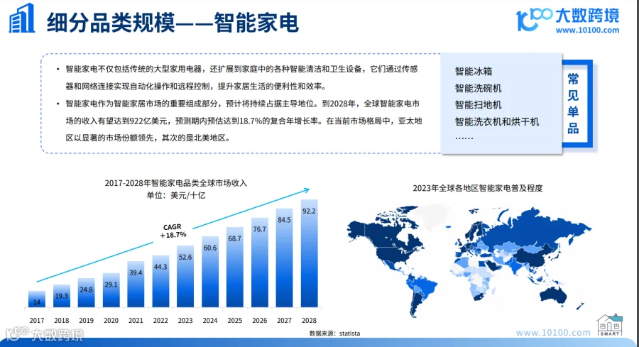 - 市场前景:到2028年,全球智能家电市场的收入有望达到922亿美元,预测期内预估达到18.7%的复合年增长率。在当前市场格局中,亚太地区以显著的市场份额领先,其次的是北美地区。