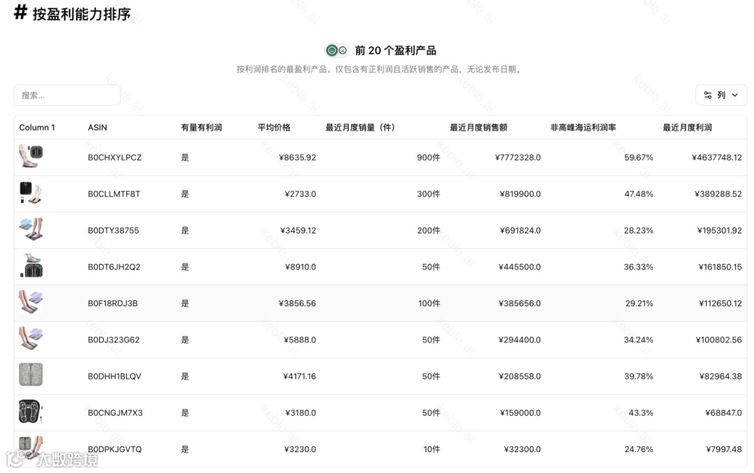 根据KebleAI-V2盈利能力排序,EMS足部按摩垫已经孕育出一批实际赚钱的产品: