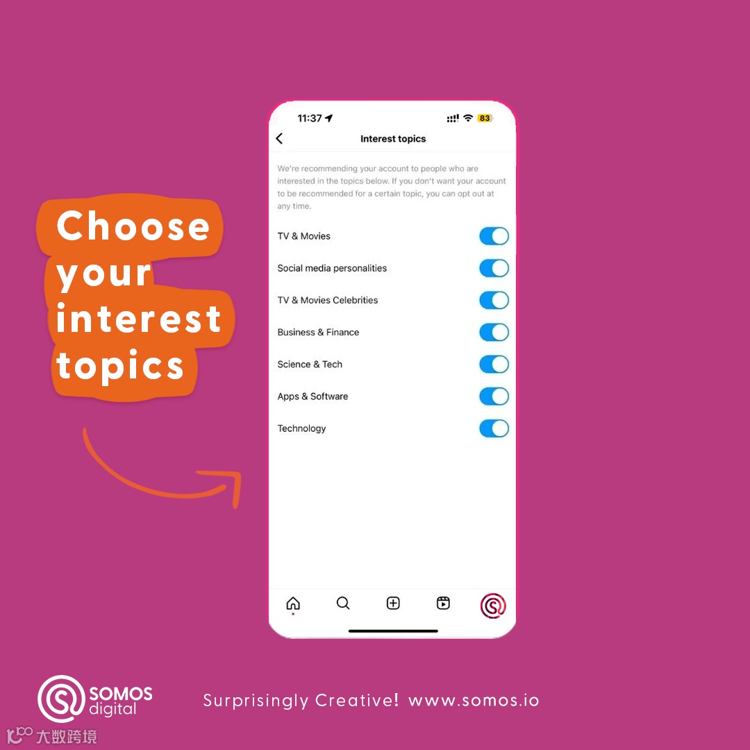 想让Instagram只向你展示特定类型的内容?打开你的Instagram设置“Settings”,隐私“Privacy”,兴趣主题“Interest topics”,选择打开或者关闭你感兴趣的话题。