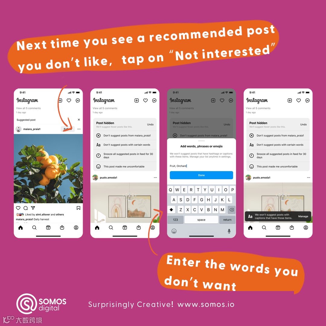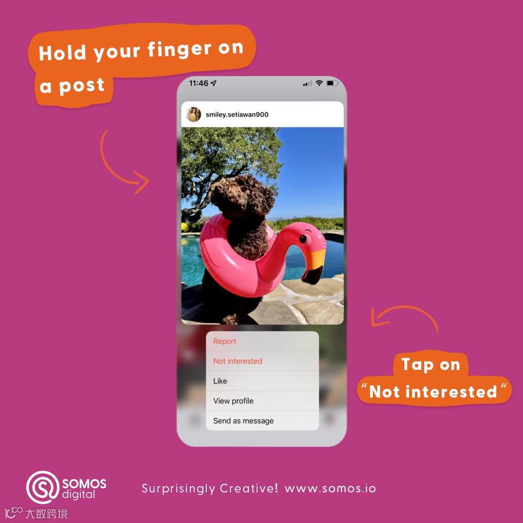 告诉Instagram算法你不想看到什么。这样,你的探索“Explore”页面、 Reels页面和搜索“Search”页面,将会更准确的推送你想看到的内容。