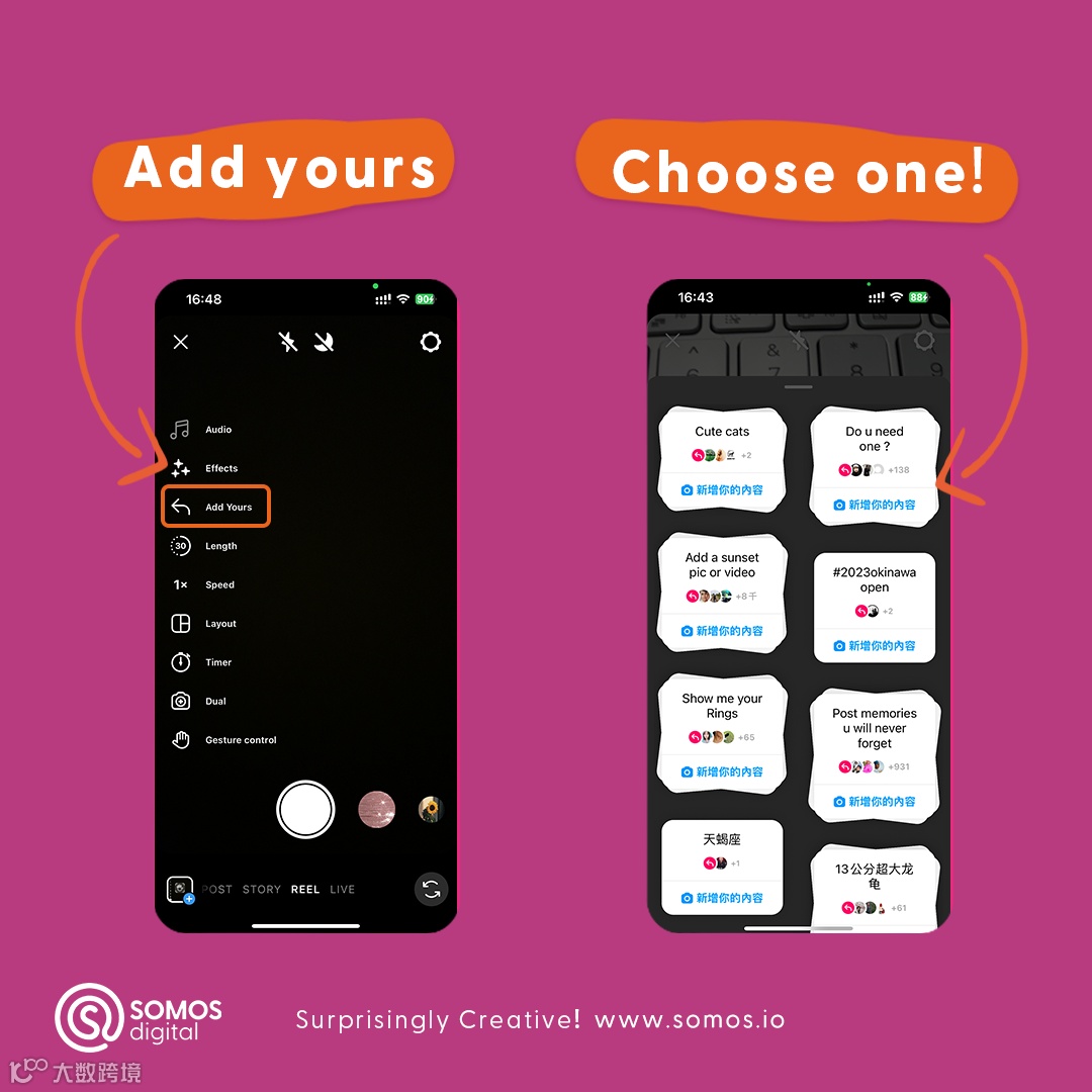 打开Reels的编辑器,点击“箭头”按钮。你会看到一群来自世界各地的人制作的“添加你的”贴纸。你可以加入任何你想要加入的方向用来创造新的,比较流行内容。