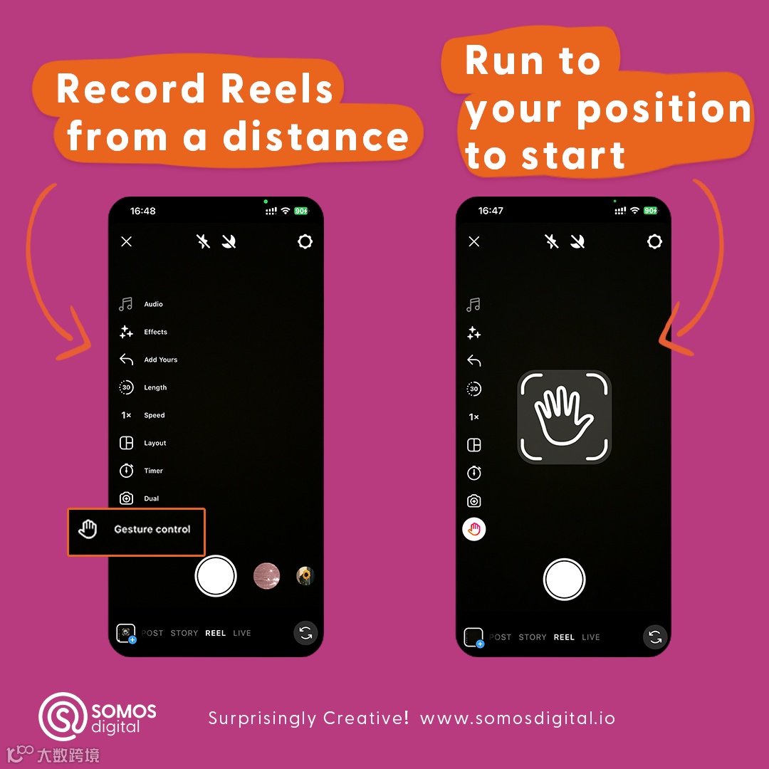 使用Reels中的“手势控制”功能,只要移动手臂,就可以开始录制视频。这样,你就不需要按下“录制按钮”再跑到远处的位置开始录制视频了。