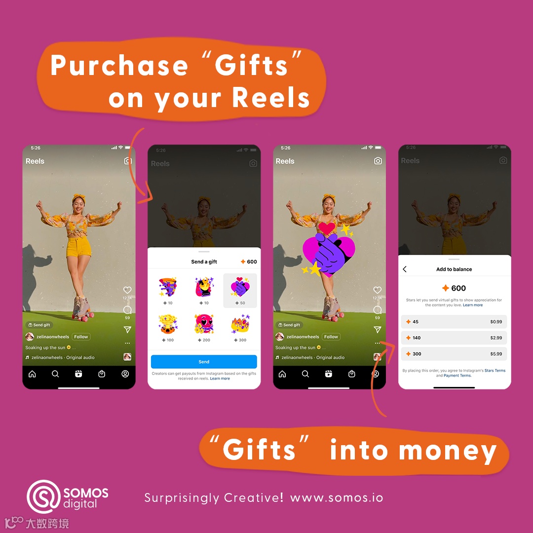 用户可以购买“礼物”来支持他们喜欢的内容创作者。如果你是内容创作者,用户可以在你的Reels上购买“礼物”。这些都是“虚拟礼物”。过一段时间,你就可以把这些礼物变成钱了。