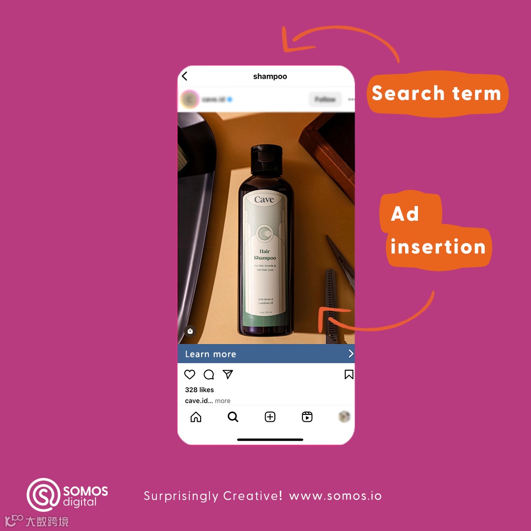 Instagram正变得越来越像谷歌"Google"你可以在Instagram搜索栏中输入关键字,然后看到搜索结果。Instagram现在在搜索结果中加入了广告。在这个例子中,如果你在搜索栏中输入"shampoo”,你会看到“shampoo”相关的广告。