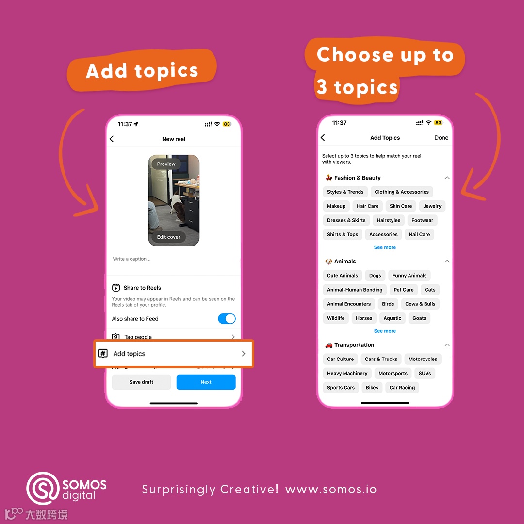 你现在可以选择Reels的“话题”。它可以帮助算法知道把你的视频展示给谁。