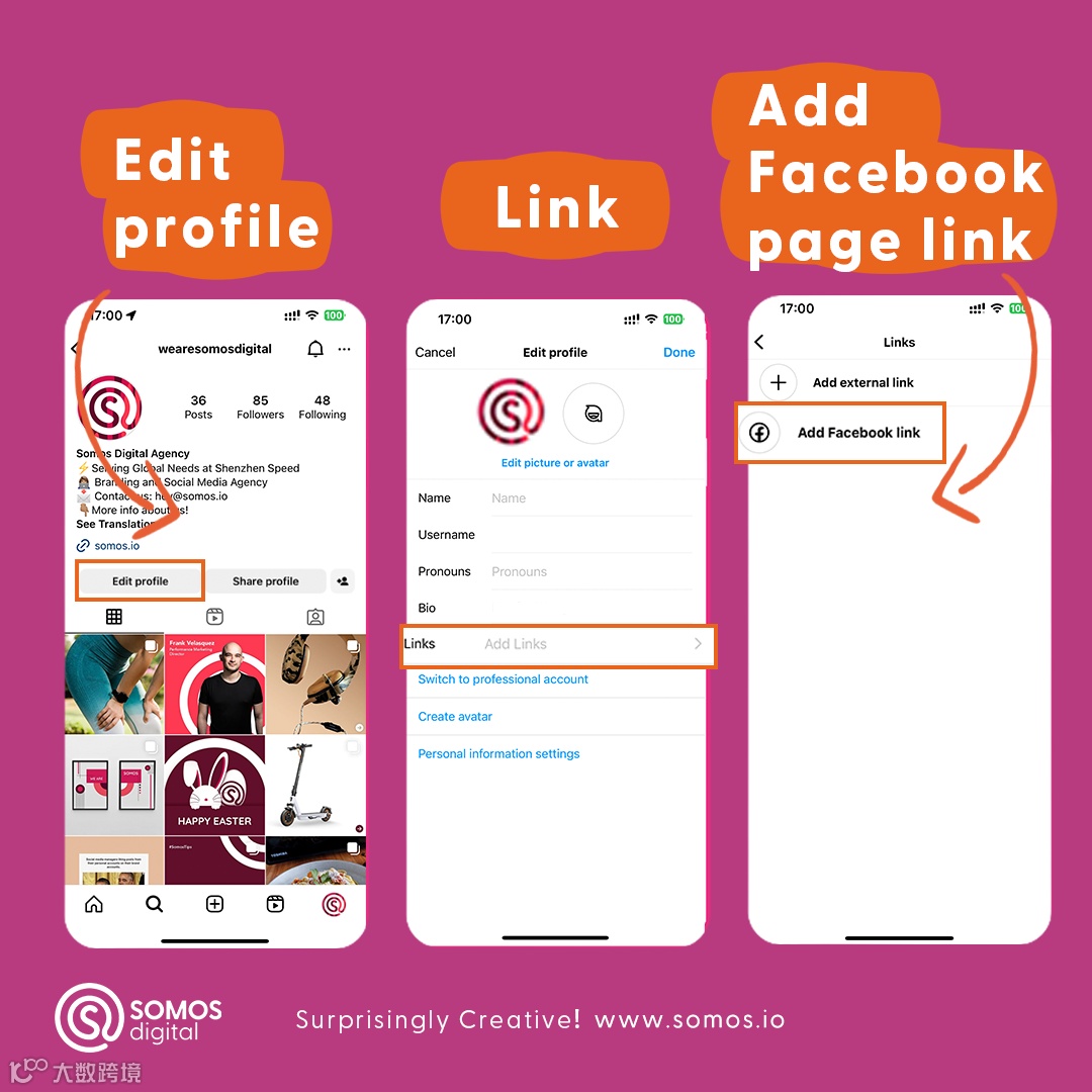 你在Facebook上很活跃,想让你的Instagram社区也加入你的Facebook吗?添加你的Facebook链接到你的Instagram个人简介,以便快速访问。
