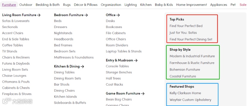 以Wayfair最大品类家具为例,红色部分是结合热销品和你过去的搜索历史的推荐品类,绿色是按照风格分的热销设计,蓝色是对特定品牌和联营品牌的推广