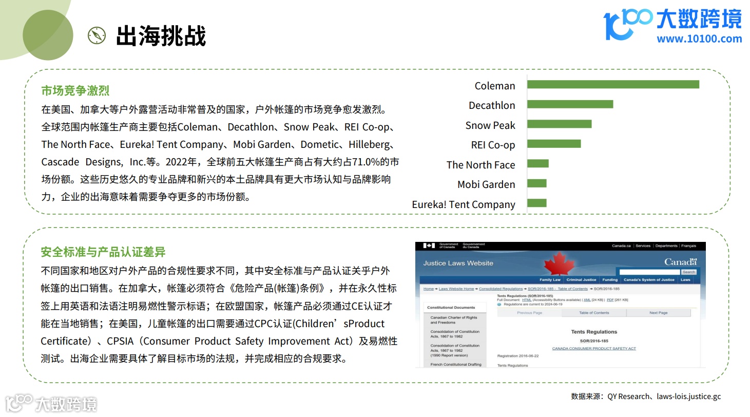 - 不同国家和地区对户外产品的合规性要求不同。例如,在加拿大,帐篷必须符合《危险产品(帐篷)条例》,并需用英语和法语注明易燃性警示标语;在美国,儿童帐篷出口需要通过CPC认证及易燃性测试。这些法规要求企业必须了解目标市场的法律法规并完成相应的合规要求。