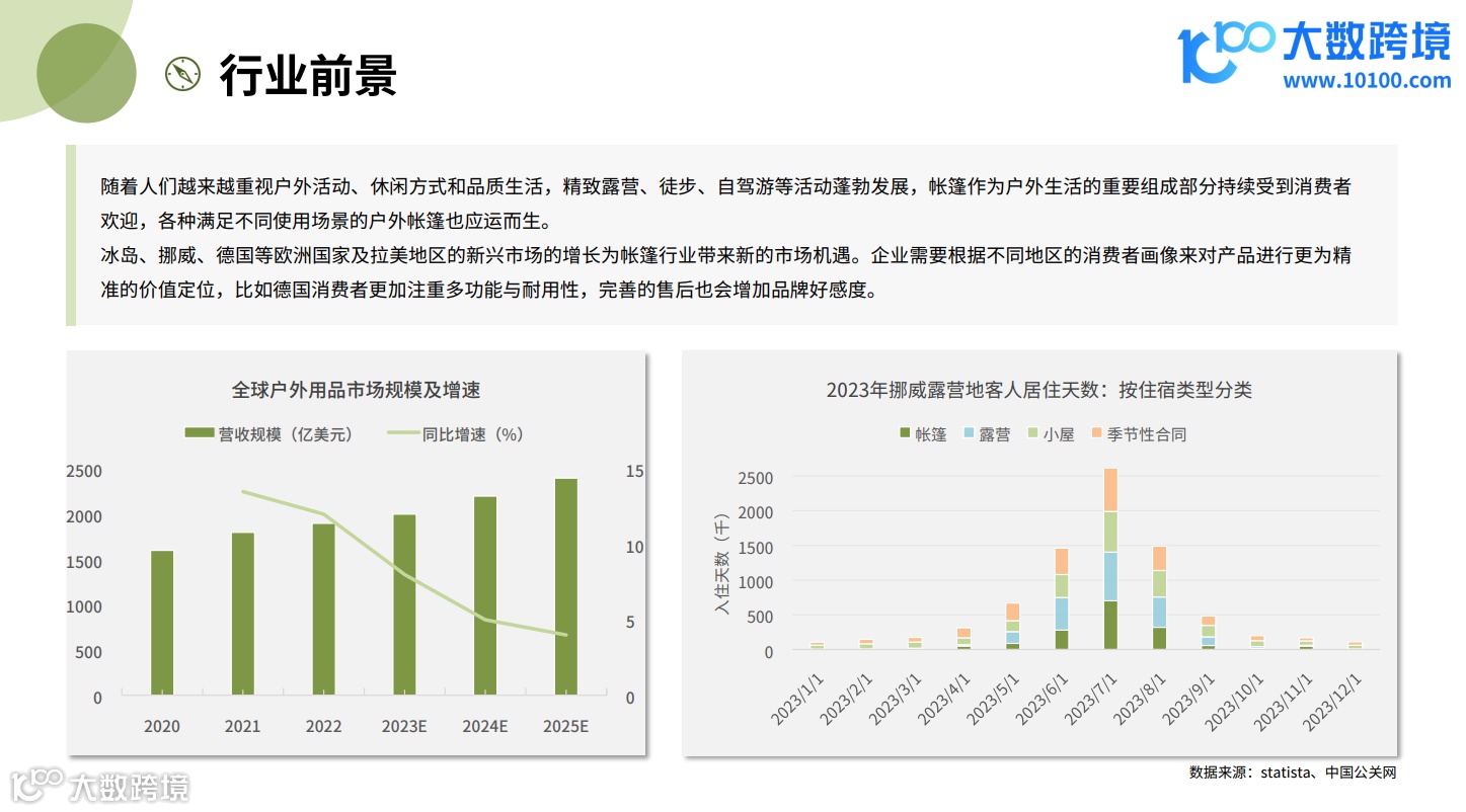- 千禧一代和Z世代是主要的消费群体之一,他们对价格较为敏感,但对设计和功能性有较高要求。他们倾向于选择设计时尚、功能多样的帐篷。这为企业提供了推出具有创新设计和高性价比产品的契机。