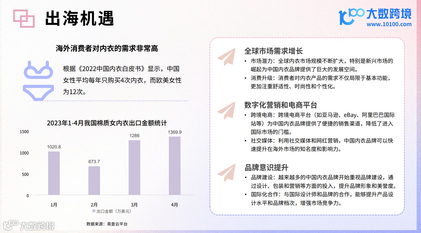 - 跨境电商平台(如亚马逊、eBay、阿里巴巴国际站)为中国内衣品牌提供了便捷的销售渠道,降低了进入国际市场的门槛。这些平台帮助品牌快速提升在海外市场的知名度和影响力。