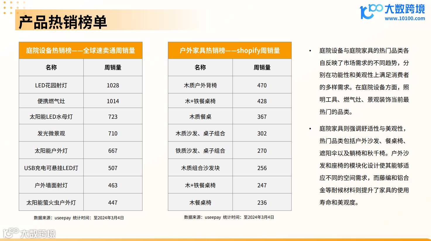 庭院设备的热门品类: 在庭院设备方面,照明工具、燃气灶、景观装饰是目前最热门的品类。这些产品满足了消费者在功能性和美观性上的需求。具体数据如LED花园射灯、太阳能户外灯、便携燃气灶等都是市场上的畅销产品。