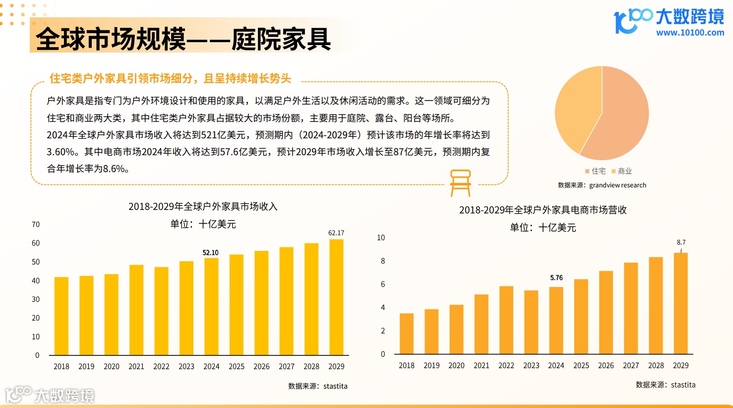 全球庭院设备市场的增长趋势: 根据《2024全球庭院用品市场洞察报告》,全球庭院设备市场在2024年的总收入将达到338.5亿美元,预测期内(2024-2029年)将以7.25%的复合年增长率(CAGR)增长。到2029年,预计市场总收入将达到480.3亿美元。这一增长的主要驱动力包括消费者对居家休闲娱乐的重视,家庭户外空间装修和美化需求的增加,以及园艺爱好的兴起。
