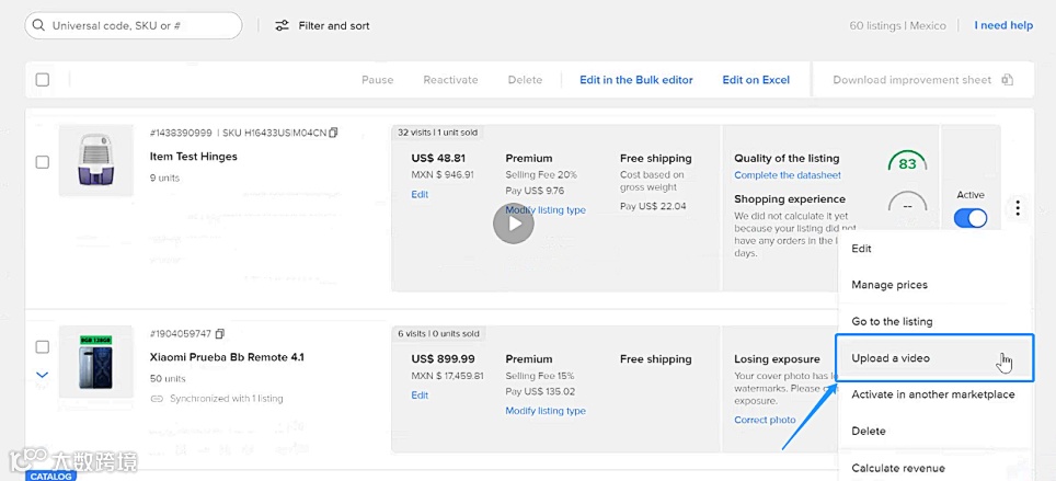 卖家可以通过两条路径上传视频,登录美客多卖家后台,打开右侧导航栏:
