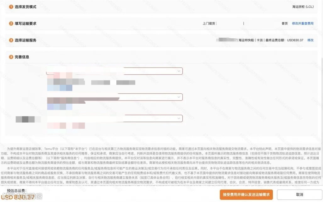 以上信息都完善后系统将显示预估总运费,再完善相关联系信息,最后确认无误点击【接受费用并确认发送运输需求】,即成功下单。
