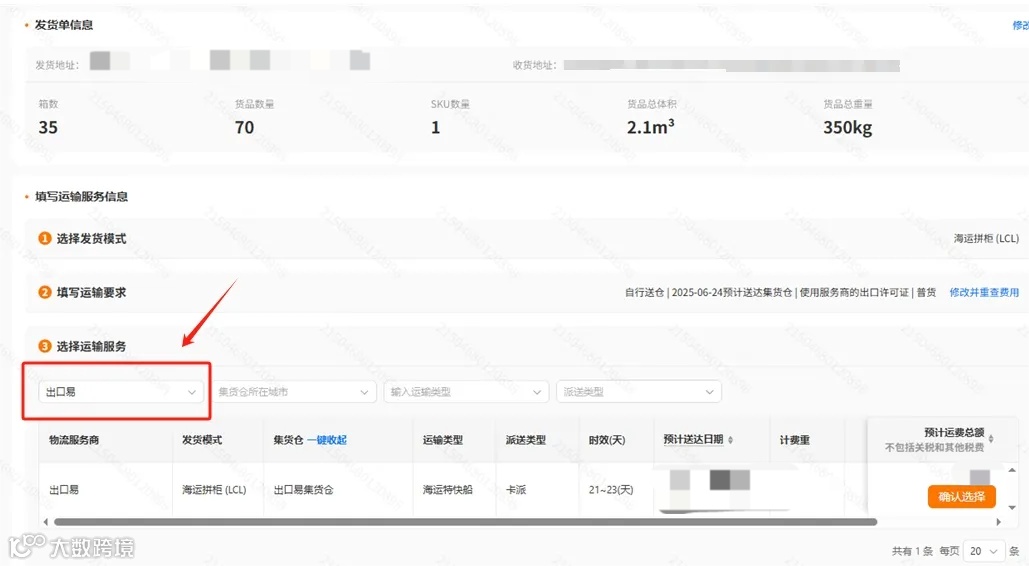 第三步:选择发货模式—填写运输要求—选择运输服务商“出口易”。