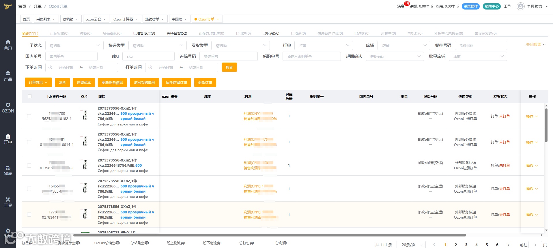 订单处理流程中,系统支持自动抓取Ozon平台订单信息,同步至系统后台统一管理,并提供订单状态跟踪(如待发货、已发货、已签收),方便卖家实时监控履约进度。