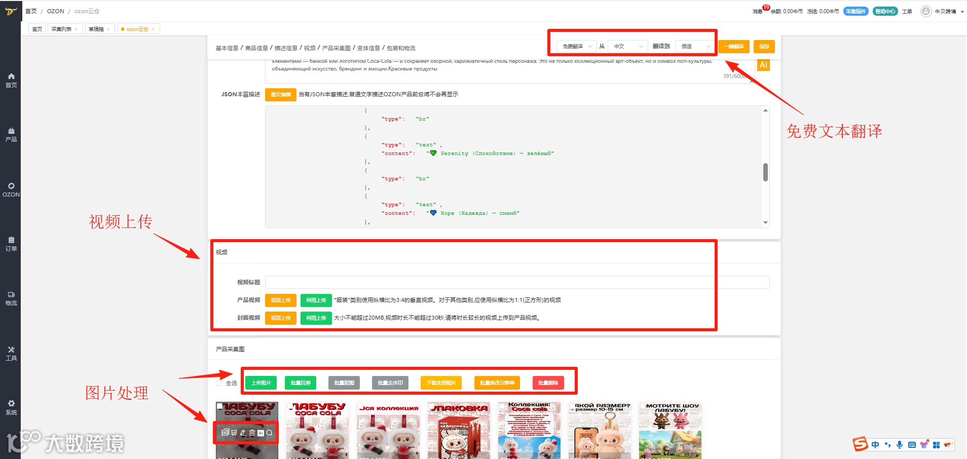 在视觉呈现层面,系统集成专业图片处理工具,支持对采集的图片进行拉伸、翻译、背景去除等操作,同时支持添加产品视频,满足Ozon平台对多媒体内容的展示要求。针对跨境场景的语言障碍,系统内置一键翻译功能,可将中文产品信息自动翻译成俄语及其他目标市场语言。