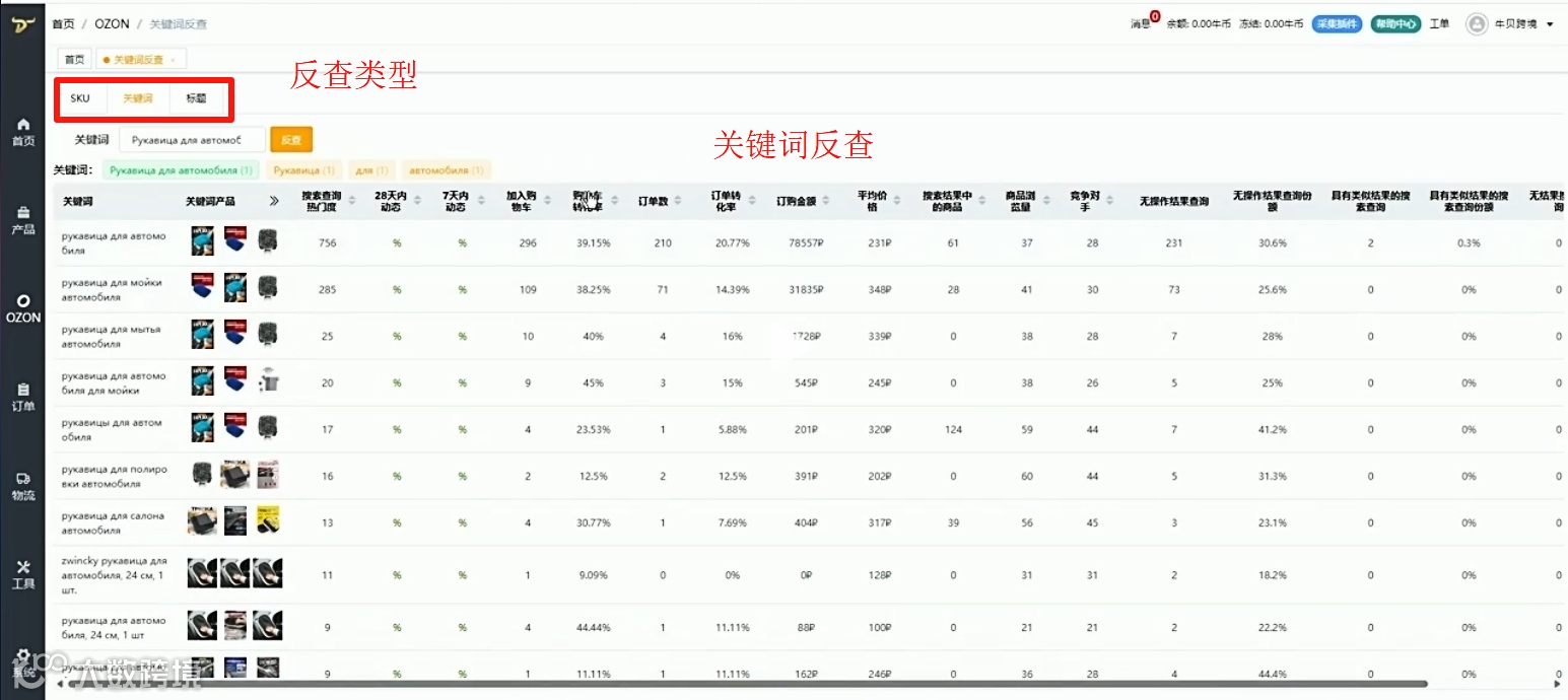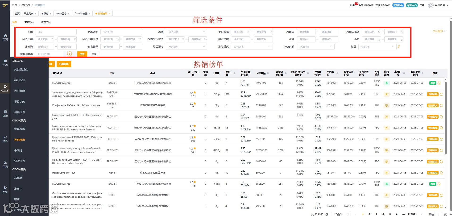 热销榜单与多维度筛选是选品模块的基础功能。系统实时同步Ozon平台的热销商品榜单,支持按行业(如3C、家居、服饰等)、品牌、价格区间等维度筛选,并展示商品的销售额、销量、增长率等核心指标,帮助卖家快速定位市场趋势。针对中国卖家重点关注的“中国馆”产品,系统提供更细化的分析维度,包括销售额、转化率、退货率、发货模式(自发货/海外仓) 等,卖家可通过组合筛选(如“转化率>5%且退货率<3%”)精准挖掘高潜力商品。