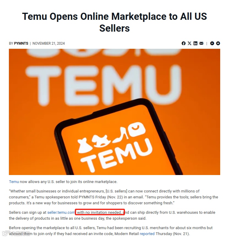 大数跨境(10100.com)观察,近期,Temu宣布现已允许美国本地卖家直接在其平台上注册并进行销售,无需邀请码,直接在TEMU上销售产品。