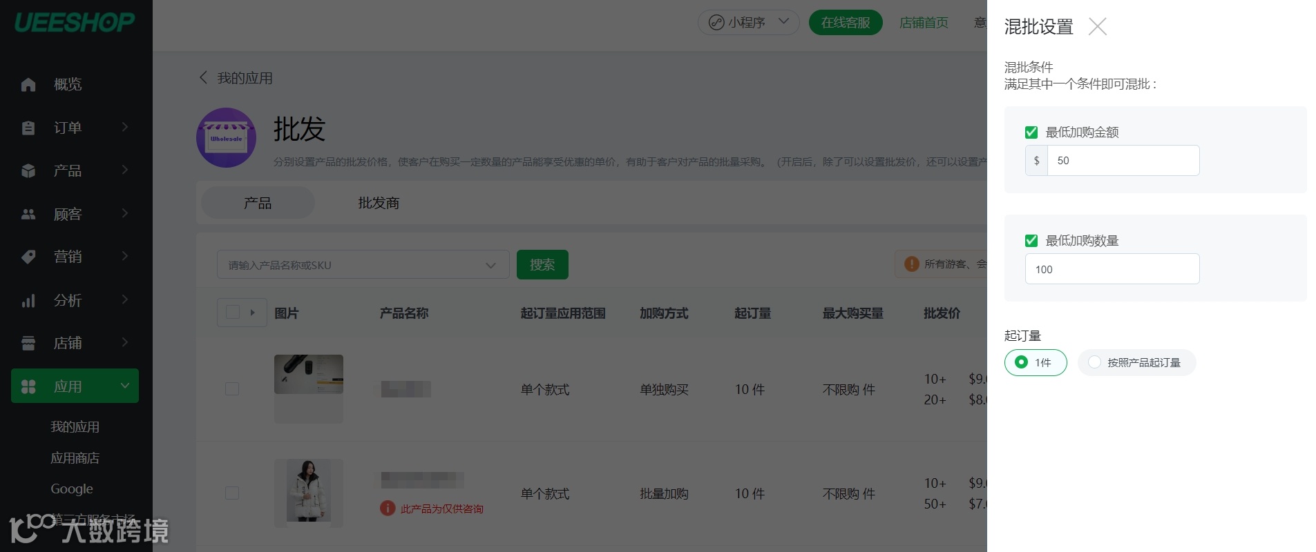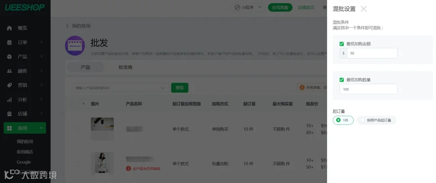 对于大部分消费者来说,他们很有可能会一次性购买多种不同的品类,但却很少会批量购买同一产品。为了促进这部分消费者的转化,卖家可以利用Ueeshop批发功能中的混批设置,为消费者提供混合购买优惠。