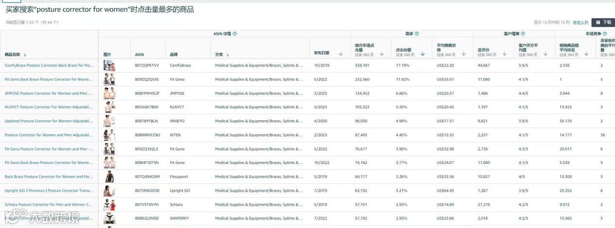 通过后台的《商机探测器》功能,我们可以发现我们“长背心”小分类主要集中在 posture corrector for women这个细分市场,也证明了我们的分类逻辑是正确的。