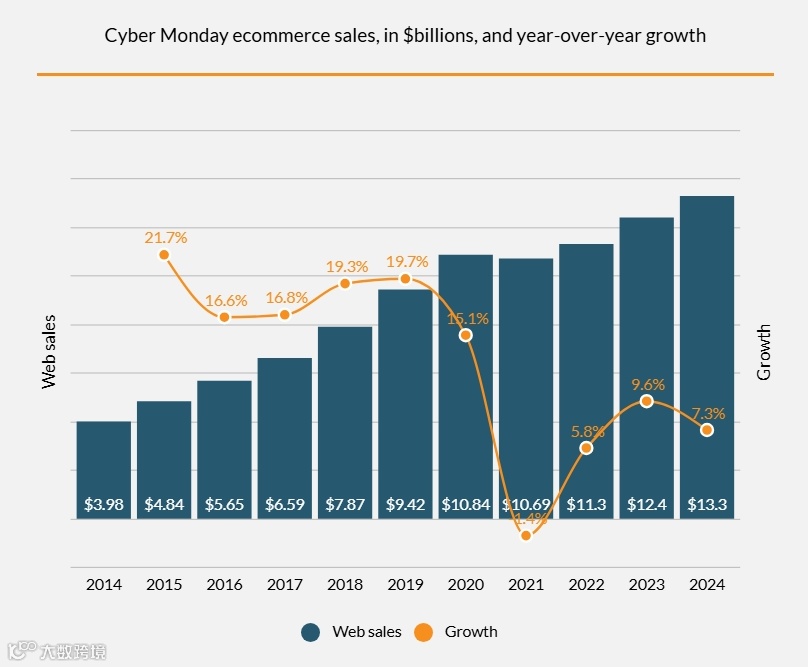 根据Adobe Analytics的数据,2024年网络星期一的总销售额达到美国历史在线销售额的最高水平,达到133亿美元,同比增长7.3%。