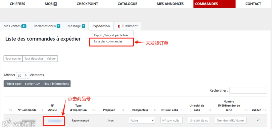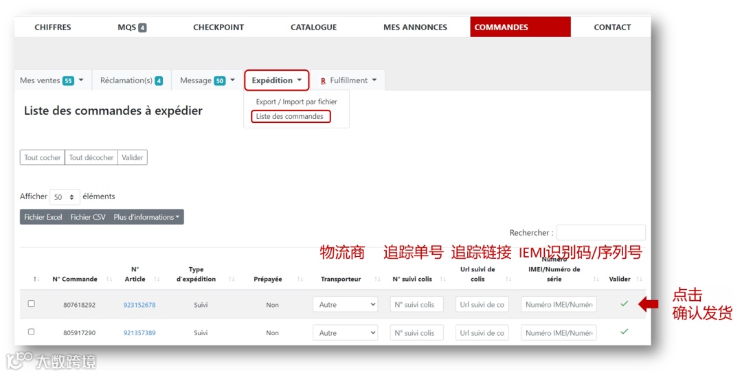 点击“Liste des commandes”按钮后,即可给单个订单填入物流单号。