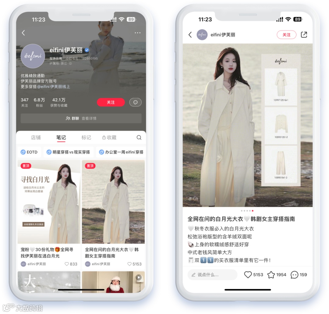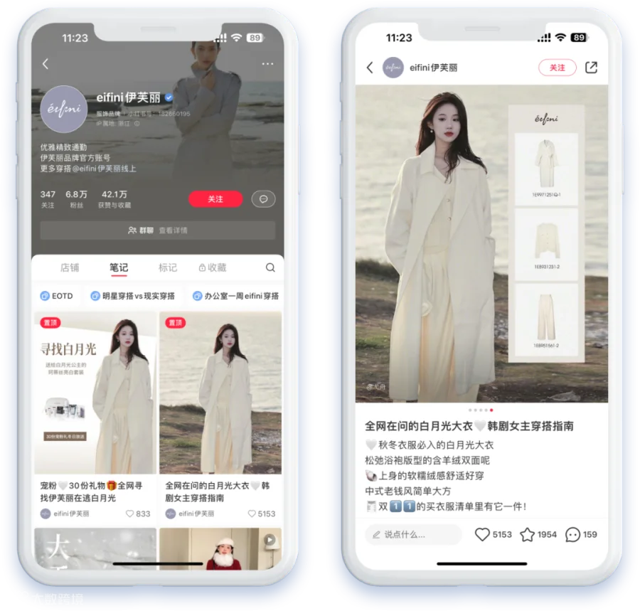 以「伊芙丽」的爆款单品“白月光大衣”为例,与该产品相关的图文笔记,并没有直白的推荐或展示大衣,更多是在渲染一种清冷、优雅的“氛围感”,得益于“达人颜值+产品+场景”三项的精准匹配,让用户在想到“白月光”这类穿搭风格时,率先想到「伊芙丽」。同时,笔记细节处展示服装质感强,且搭配难度低,更容易激发起用户的穿搭模仿欲,从而实现品牌声量和销量的提升。