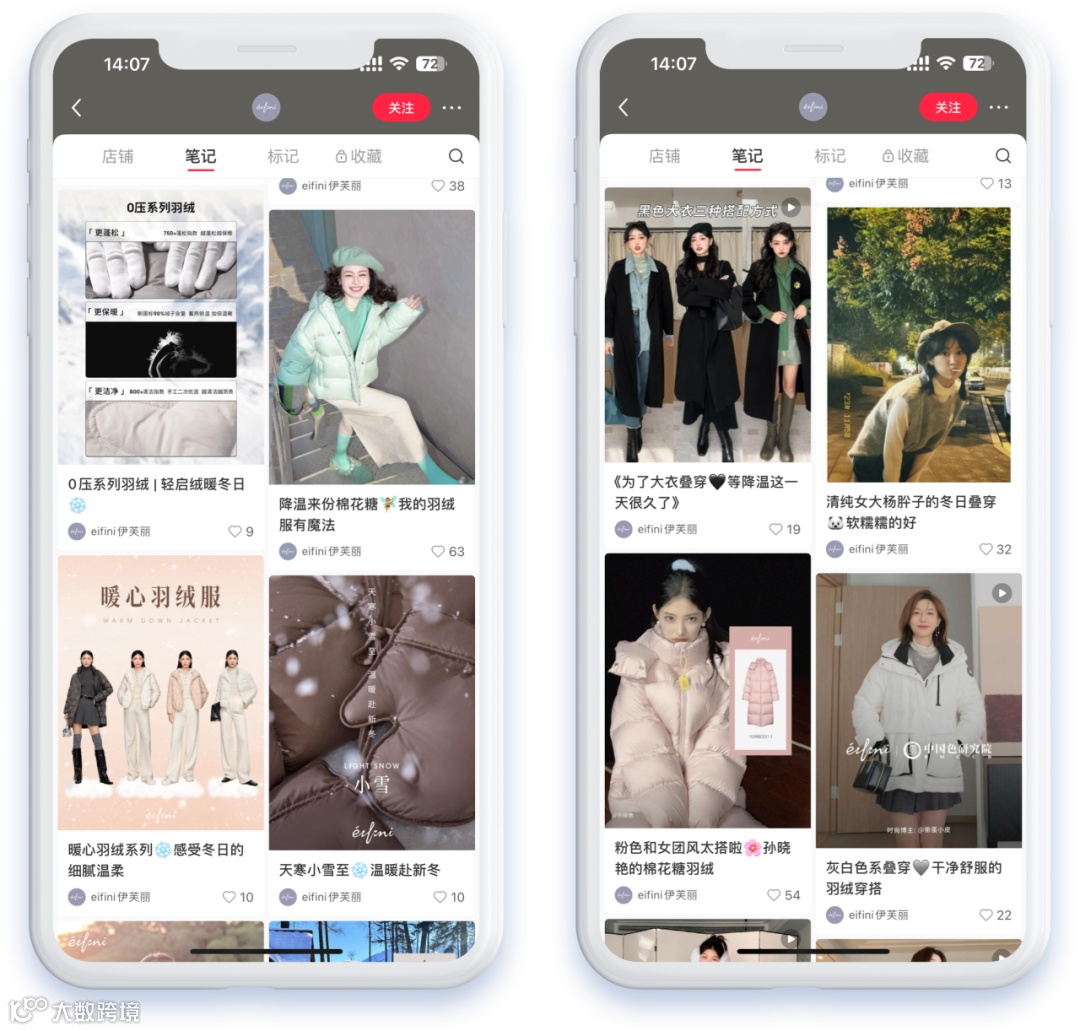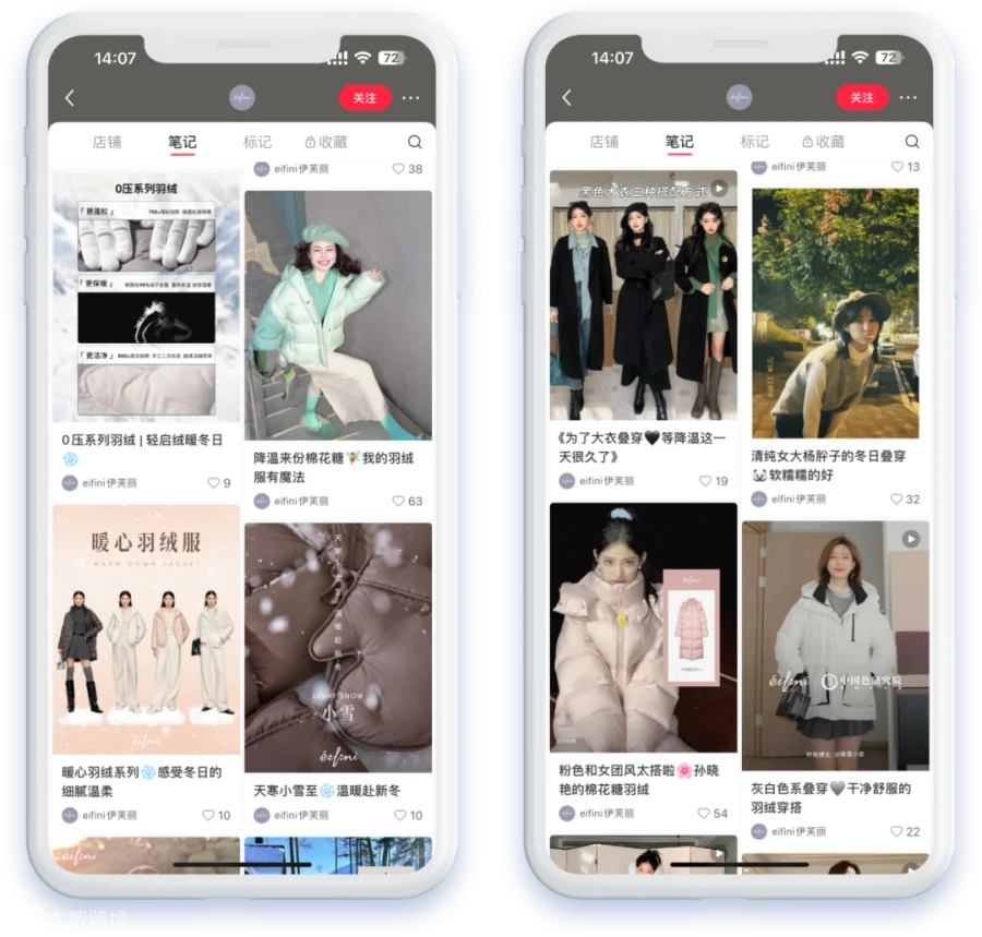 在产品打造上,「伊芙丽」全新升级0压羽绒、高支羊毛、山羊绒、骆驼绒等面料,为消费者打造更舒适、有质感的穿着体验。在内容输出上,注重品牌调性的同时也兼具实用性、话题性与趣味性,在保持本身品牌DNA的同时,玩出新花样。比如:基于明星穿搭,产出“明星同款不同美”主题内容;紧跟热点,产出美拉德配色穿搭种草笔记;挖掘客户需求,围绕都市女性的穿着场景,产出“一衣多穿”的多样化搭配方案,解决客户的穿搭难题。