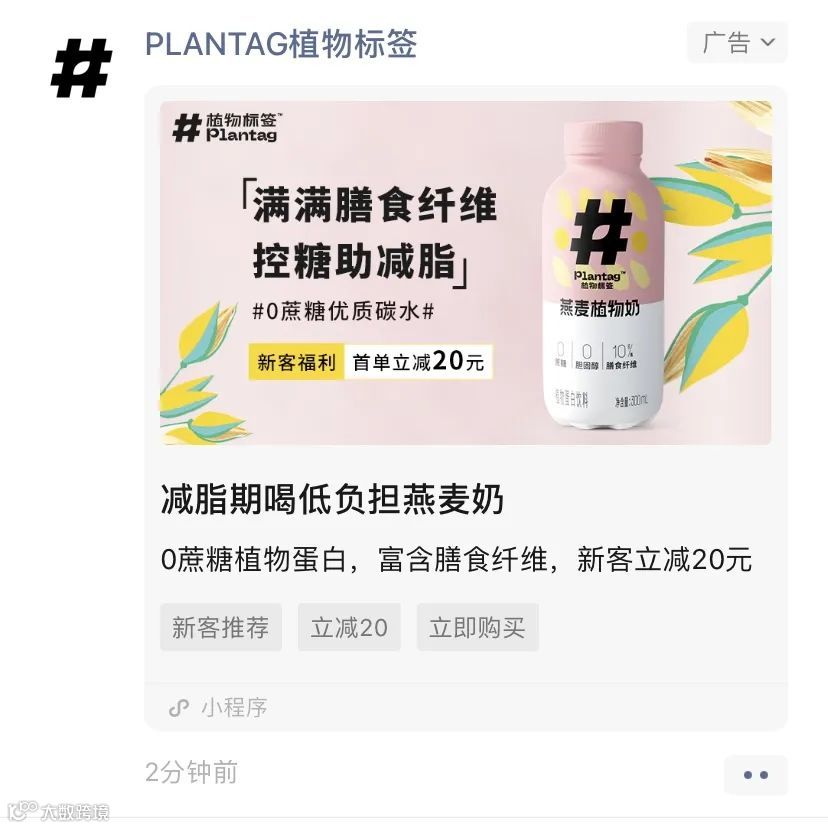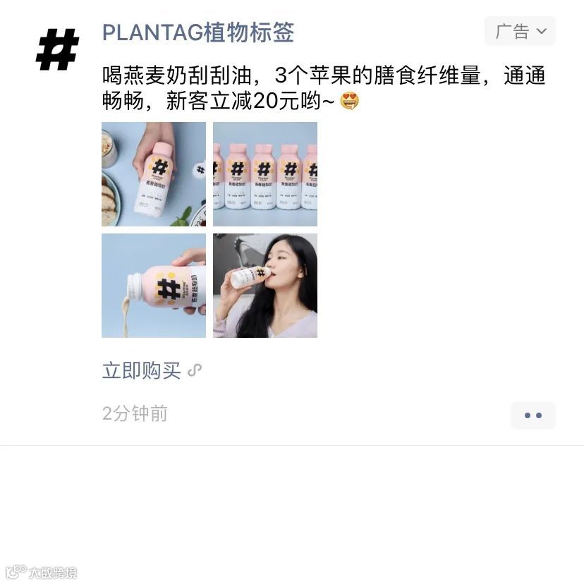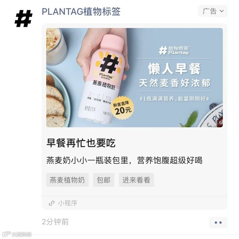 在此背景下,微盟广告团队基于历史投放经验,为「植物标签」量身定制朋友圈广告创意素材,选择卡片+多图样式结合,收割用户注意力。其中,卡片样式展现品牌调性,背景突出产品高颜值外观,卡片底部标签充分展示产品核心卖点,吸引用户一键点击跳转,与消费者一起探索植物基产品的更多可能。