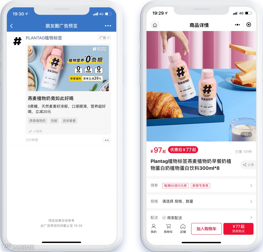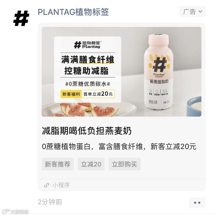 为了助力全渠道推广新品上市,今年7月,「植物标签」通过“腾盟计划2.0”与微盟展开合作。在微盟运营团队的助力下,「植物标签」首次搭建微信生态下的小程序系统,并借助广告对微信生态用户进行更深入的洞察,通过制定食品快消行业首推的“朋友圈广告拉新+小程序直购转化”的运营策略,不断提升品牌用户拉新、转化及复购的效率,实现智慧增长。