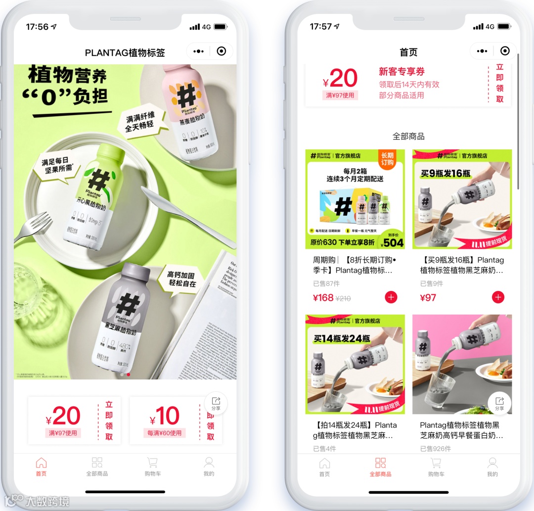同时,针对那些对品牌认知不足,处在好奇、观望和纠结阶段的潜在目标客户,「植物标签」品牌团队与运营团队深入挖掘,在商城首页设置多重促销折扣、优惠福利作为钩子,借助首页明显的满减优惠券,并搭配商品页产品“多买多送”的超值福利,多次优惠触达、付邮尝鲜等吸引方式,进一步助力新客完成转化。